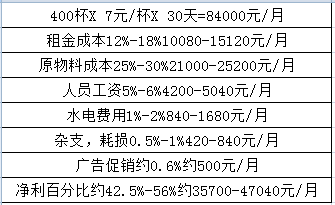 蜜雪冰城运营成本分析,以每天400杯为例,400杯X 7元/杯X 30天=84000元/月